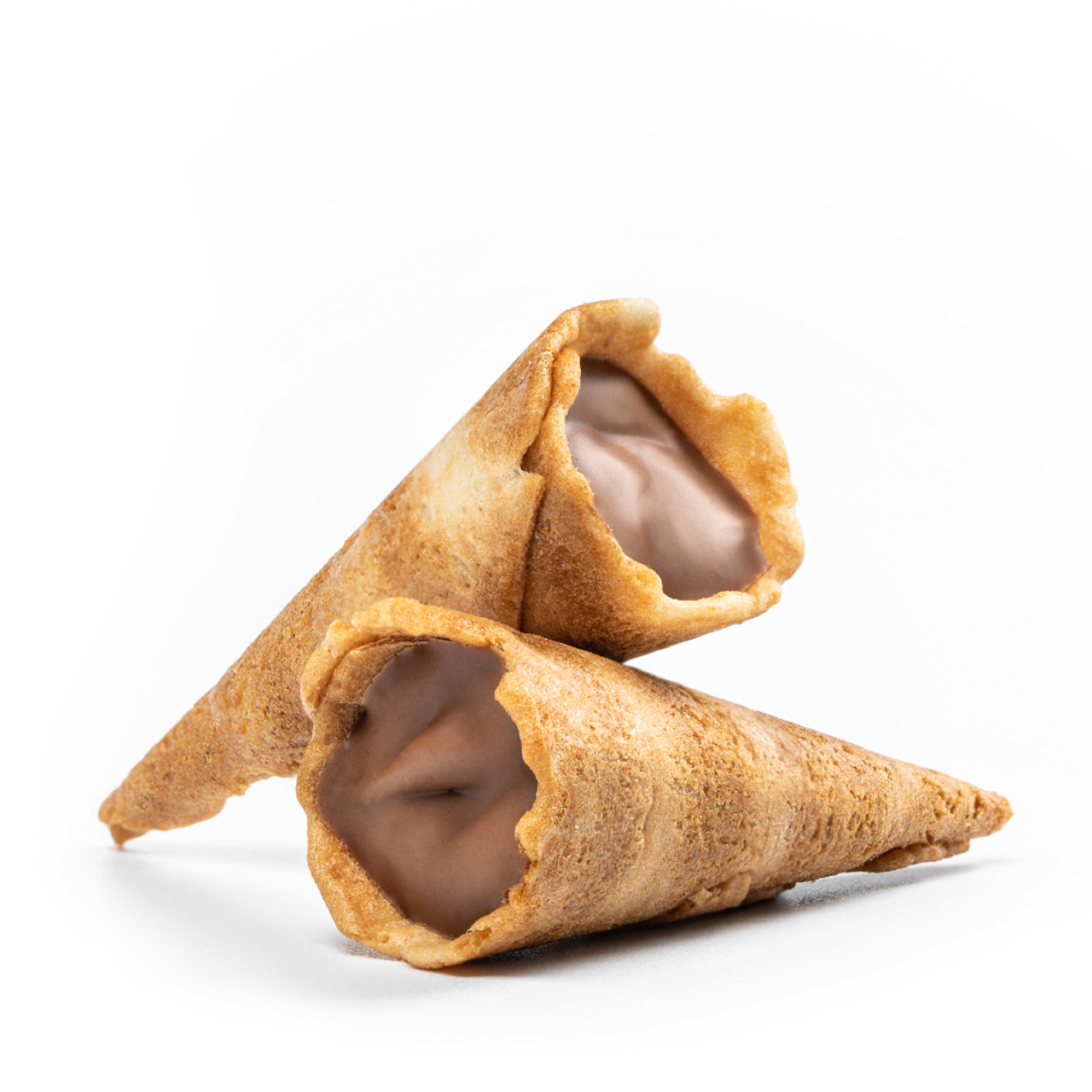 Zehn herrlich knusprige Waffeltütchen gefüllt mit einer lieblichen Ganache aus Vollmilchschokolade und spanischer Haselnusscreme.