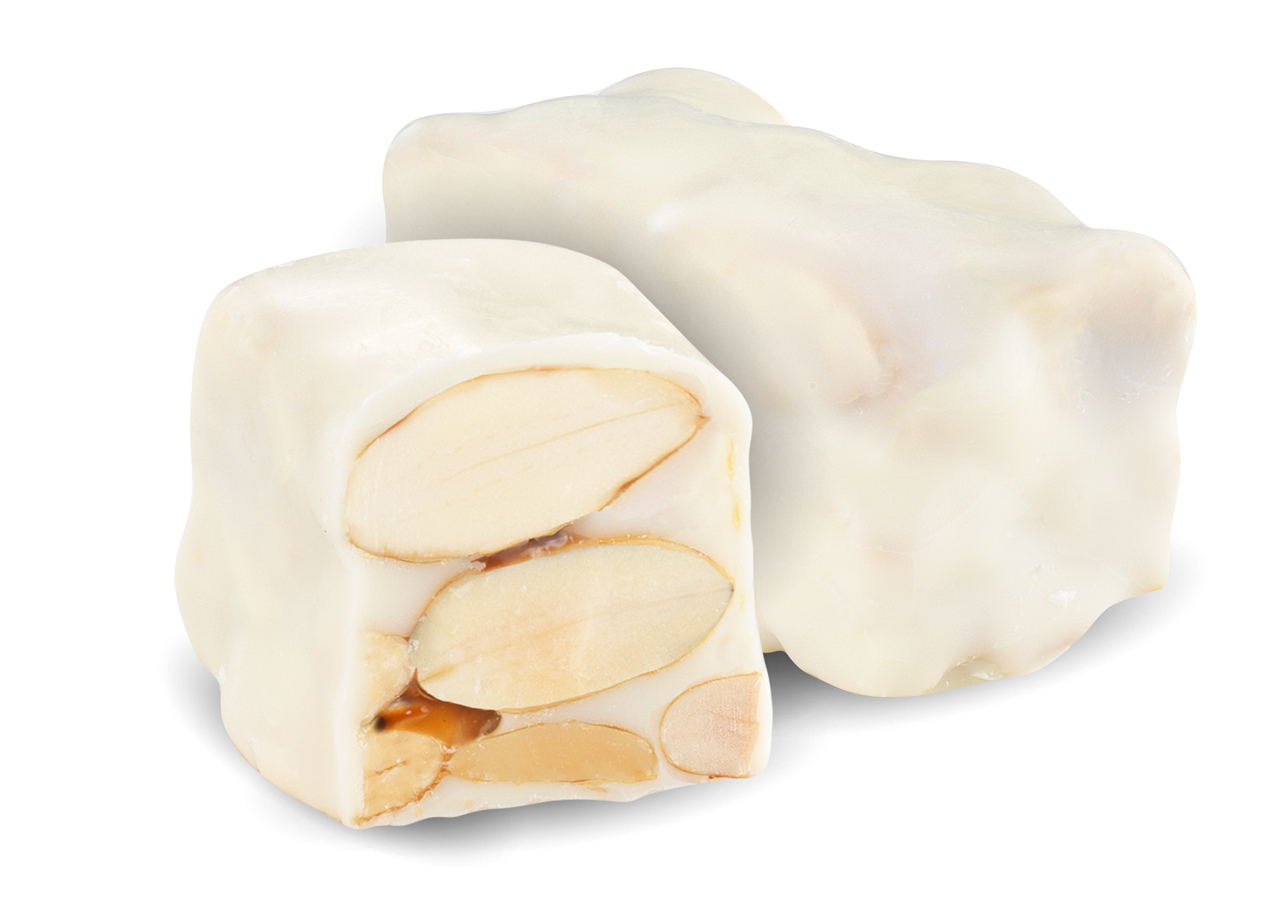 Mandelkrokant in weißer Schokolade. In weiße Schokolade getauchtes kalabrisches knuspriges Mandelkrokant, aus besten mit Orangenblütenhonig und Zucker karamellisierten Avola-Mandeln. Einzeln verpackt.