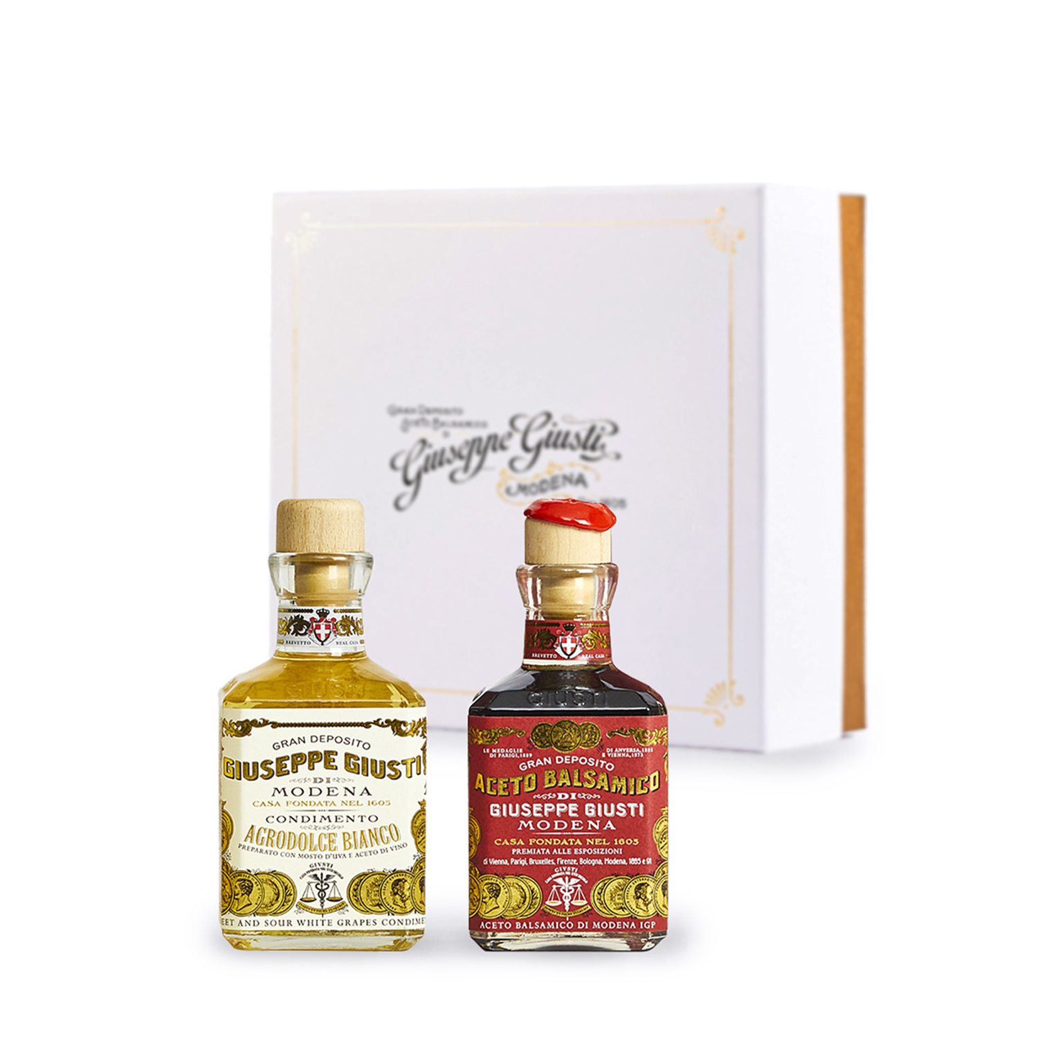 Geschenkkarton mit Balsamico & weißem Essig | Eine perfekte Kombination bestehend aus dem repräsentativsten Produkt des Hauses Giusti – dem Balsamico di Modena IGP mit 3 Goldmedaillen, und einer frischen, weißen Essigspezialität, mit zart süßen Fruchtnoten und dem blumigen Duft weißer Trauben. Zwei sehr vielseitige und ausgewogene Produkte, die jedes Gericht aufwerten.