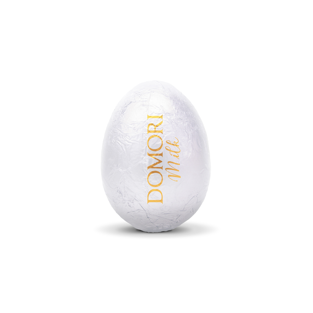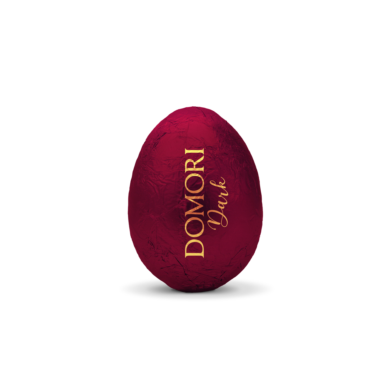 Kleine Pouch gefüllt mit Ostereiern (EB/VM) | Das kleine rosa-orange gestreifte Täschchen mit Reißverschluss ist aus Papier und ist gefüllt mit Eiern aus dunkler Schokolade mit Haselnussfüllung und Eiern aus Milchschokolade mit Gianduja-Füllung.