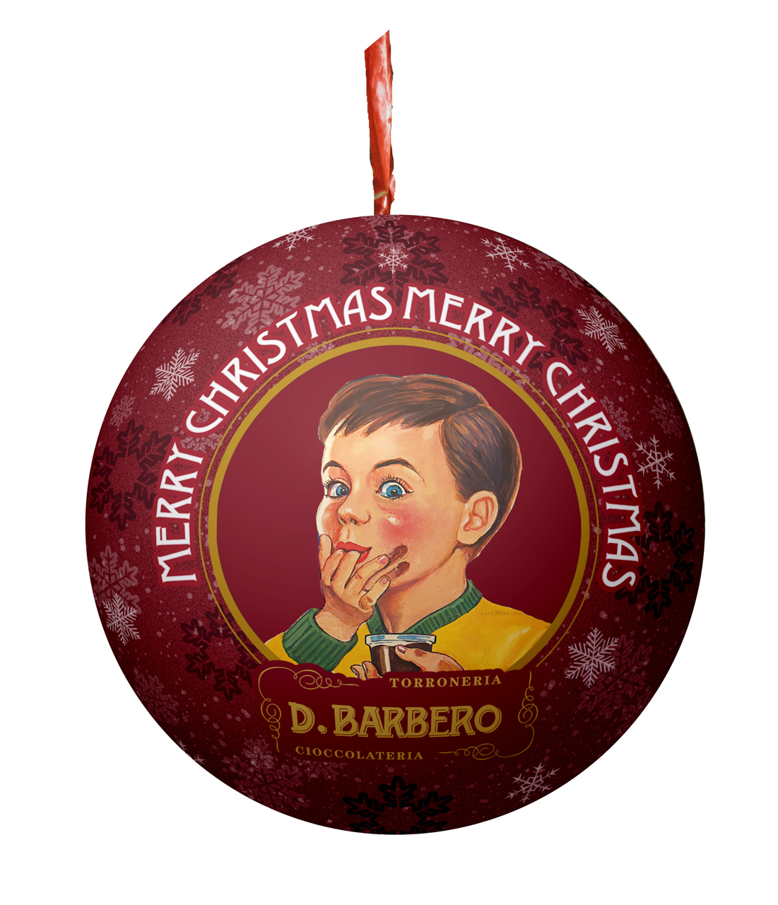 Mit Pralinen gefüllte Christbaumkugeln | Die roten und blauen Christbaumkugeln aus Metall sind gefüllt mit je 50 g einzeln verpackter Cricri-Pralinen, einer ursprünglich aus Turin stammendenden Haselnusspraline. Leicht geröstete